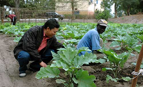 2月6日,在塞內(nèi)加爾的桑加勒卡姆中國(guó)援助塞內(nèi)加爾農(nóng)業(yè)技術(shù)培訓(xùn)中心,中國(guó)援塞農(nóng)業(yè)技術(shù)組組長(zhǎng)、高級(jí)農(nóng)藝師楊廷明(左)在示范田指導(dǎo)當(dāng)?shù)貙?shí)習(xí)人員培植蔬菜。中國(guó)于2006年11月向塞內(nèi)加爾派遣了首批農(nóng)業(yè)技術(shù)專(zhuān)家,對(duì)當(dāng)?shù)剞r(nóng)民進(jìn)行蔬菜和水稻種植技術(shù)培訓(xùn)。 |