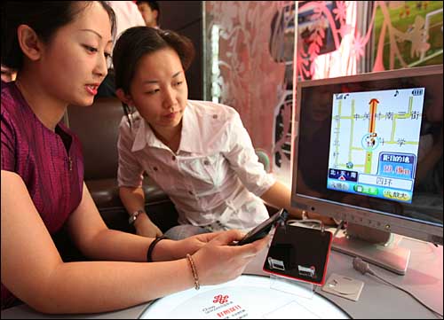 5月17日,一名工作人員在為參觀者展示手機的電子導航功能。當日,中國聯(lián)通與美國某公司在北京中關(guān)村建成CDMA體驗中心。