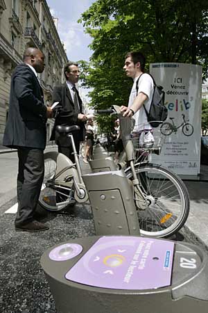 13日,法國巴黎市政廳工作人員在街頭展示“自助自行車”。為了鼓勵更多市民采取環(huán)保的交通方式出行,到7月15日,將有10648輛自行車被投放到巴黎的750個車站。租借這些自行車的人們可以在其他車站還車,非常方便。