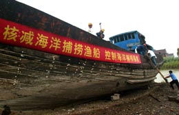 8月28日,工人在拆解報廢漁船。 當日,農(nóng)業(yè)部漁業(yè)局及東海區(qū)漁政漁港監(jiān)督管理局在上海舉行回收的海洋捕撈漁船主機功率憑證集中銷毀儀式,同時,對部分轉產(chǎn)報廢漁船進行了現(xiàn)場拆解。據(jù)悉,由于我國目前海洋漁業(yè)資源持續(xù)衰退,現(xiàn)有捕撈力量嚴重過剩,到2010年,我國將消減三萬艘捕撈漁船,轉移約20萬勞動力,以確保我國海洋漁業(yè)的可持續(xù)發(fā)展。 |