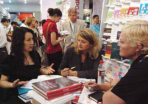 8月30日,來自南非的書商在圖博會上與外文出版社的負(fù)責(zé)人(左)商談購買有關(guān)圖書版權(quán)事宜。