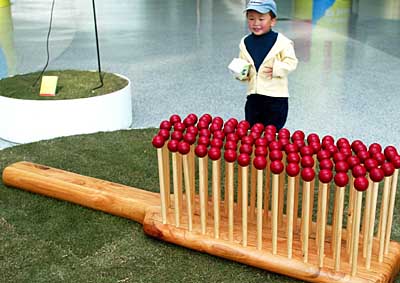 11月21日,一個(gè)小朋友在展覽上觀看木制的大毛刷。 近日,“創(chuàng)意世博——?dú)夂蚩崤,設(shè)計(jì)先行展”在上海科技館舉行。展覽展出了英國(guó)設(shè)計(jì)師們創(chuàng)意十足的環(huán)保產(chǎn)品,提供了一個(gè)全新的視角來(lái)看待氣候變化問(wèn)題,倡議人們?cè)谏钪袦p少浪費(fèi),再利用、循環(huán)利用能源,自己動(dòng)手制作環(huán)保且個(gè)性化的物品。 | |