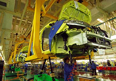 11月27日,長(zhǎng)安汽車(chē)集團(tuán)在2007年長(zhǎng)安汽車(chē)海外商務(wù)大會(huì)上向媒體透露,長(zhǎng)安汽車(chē)整車(chē)出口呈現(xiàn)高速增長(zhǎng)態(tài)勢(shì),預(yù)計(jì)2007年汽車(chē)整車(chē)出口量將首次突破4萬(wàn)輛。圖為工人在長(zhǎng)安奔奔轎車(chē)生產(chǎn)線上工作(資料照片)。 | |