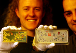 北京2008年奧運會五福賀歲金、銀條將于1月8日在北京上市銷售!拔甯YR歲金、銀條”由北京奧組委授權(quán)、中國印鈔造幣總公司制造發(fā)行、中鈔國鼎投資有限公司總經(jīng)銷。“五福賀歲金條”規(guī)格分別為50克、100克、500克和1000克四種;“五福賀歲銀條”規(guī)格分別為50克、100克和1000克三種。