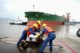 全國最大商用石油和保稅油品倉儲企業(yè)中化興中石油轉(zhuǎn)運(yùn)(舟山)有限公司所屬岙山基地,2007年年吞吐各類油品達(dá)1539.41萬噸。圖為一艘30萬噸級油輪“阿波羅榮耀”號裝載11萬噸燃料油靠泊在岙山基地。
