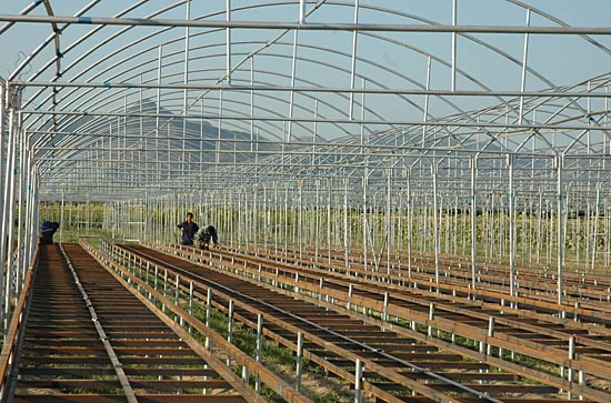 海南省積極探索,大力發(fā)展熱帶農(nóng)業(yè)。位于三亞崖城鎮(zhèn)的海源實(shí)業(yè)有限公司的果蔬基地,帶動(dòng)了200多戶農(nóng)民種植上萬畝的綠色瓜菜,種子、農(nóng)藥、化肥使用既定產(chǎn)品。這里生產(chǎn)的綠色瓜菜大部分運(yùn)往港澳地區(qū)。圖為正在建設(shè)的三亞海源實(shí)業(yè)有限公司無土栽培大棚。