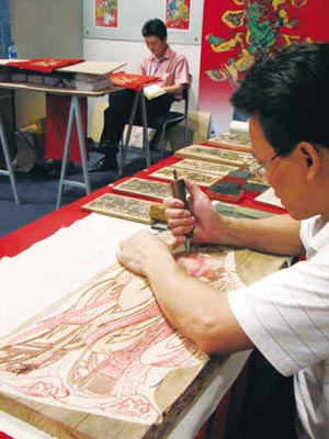 年畫如今在城市里已很少能見到,而藝人刻版技藝表演也只有在展覽會中才能參觀到。陳輝/攝 | 年畫市場復(fù)蘇