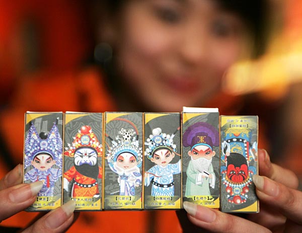 2月13日,在北京一家專營火柴盒的小鋪內(nèi),一女孩展示印有京劇臉譜卡通畫的火柴盒。