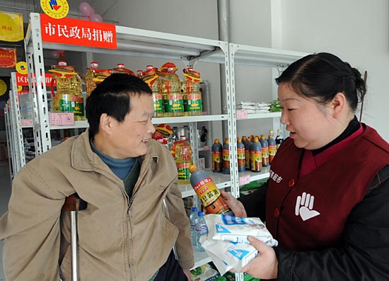 | 3月11日,南京市秦淮區(qū)夫子廟街道“慈善超市”的一名工作人員(右)幫助低保受助人員戴德元挑選商品。日前,南京市秦淮區(qū)夫子廟街道“慈善超市”在新址開張,店內(nèi)的大部分商品是捐贈(zèng)品,價(jià)格分市場(chǎng)價(jià)、愛心價(jià)和慈善價(jià)三種。市場(chǎng)價(jià)等同普通超市的價(jià)格;愛心價(jià)要比市場(chǎng)價(jià)上浮20%,顧客可以自愿選擇愛心價(jià)獻(xiàn)愛心;而慈善價(jià)要比市場(chǎng)價(jià)低10%,主要針對(duì)城市受助的特困人群。超市所得純利潤(rùn)充入慈善基金,用于對(duì)特困群眾的幫扶。目前,南京市已建立了116家街道慈善超市。 | |