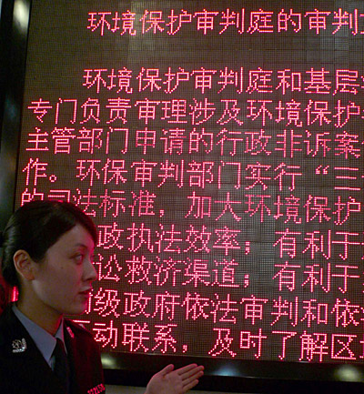 江蘇省無錫市法院6日成立專門的環(huán)境保護審判法庭,以加強對太湖等地環(huán)境生態(tài)的司法保護力度。這也是江蘇首個分別在兩級法院設(shè)立專門的審判庭與合議庭的環(huán)保法庭,建成后除了進行環(huán)保審判工作外,還將積極探索環(huán)境公益訴訟。 據(jù)介紹,近3年,無錫市兩級法院共受理各類涉及環(huán)保的訴訟案件18件,涉及環(huán)保的行政非訴審查案件273件,特別是去年太湖出現(xiàn)水生態(tài)危機以來,環(huán)保糾紛有所增加,環(huán)境犯罪沒有被依法追究責(zé)任、環(huán)境受害者的合法權(quán)益得不到有效保護的情況依然存在。 據(jù)無錫市中級人民法院院長褚紅軍介紹,設(shè)立專門的環(huán)境保護審判機構(gòu),實現(xiàn)專業(yè)化審判,將充分整合現(xiàn)有的司法資源,實行刑事、民事、行政“三合一”的全新審判模式,統(tǒng)一環(huán)境訴訟案件的司法標準。根據(jù)職能劃分,無錫環(huán)保法庭將依法審判涉及轄區(qū)內(nèi)水土、山林保護的排污侵權(quán)、損害賠償?shù)纫、二審案件,負?zé)對有關(guān)部門和企業(yè)提出環(huán)境保護方面的司法整改建議,并做好相關(guān)的法制宣傳工作。 無錫市中級人民法院一名法警在介紹環(huán)保法庭的有關(guān)情況。新華社記者