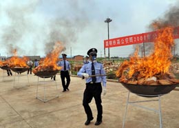 6月24日,幾位警察點(diǎn)燃將被銷毀的毒品。當(dāng)日,昆明鐵路公安局在“6·26”國際禁毒日前夕公開銷毀150余公斤毒品,包括海洛因、冰毒、鴉片、搖頭丸等。