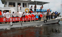 7月9日,在中俄界河黑龍江黑河段舉行的魚(yú)苗放流活動(dòng)現(xiàn)場(chǎng),出席活動(dòng)的來(lái)賓向黑龍江放流魚(yú)苗、魚(yú)種。 當(dāng)日,2008年中俄邊境水域漁業(yè)資源增殖放流活動(dòng)在中俄界河黑龍江黑河段舉行,15萬(wàn)尾鱘鰉魚(yú)苗和100萬(wàn)尾黑龍江野鯉魚(yú)苗放流黑龍江。 |