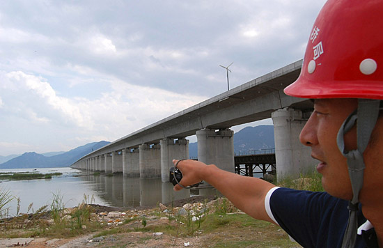 | 8月25日,一名工人介紹溫福鐵路建設(shè)情況。8月26日凌晨,全國“八縱八橫”鐵路網(wǎng)骨架之一的國家重點(diǎn)建設(shè)項(xiàng)目溫福鐵路全線跨度最大的橋梁——田螺大橋順利合龍。溫福鐵路是中國沿海鐵路大通道,建成后將使溫州市與珠江三角洲、長江三角洲以及海峽西岸經(jīng)濟(jì)區(qū)三大經(jīng)濟(jì)發(fā)達(dá)地區(qū)連接起來,對(duì)促進(jìn)區(qū)域經(jīng)濟(jì)協(xié)調(diào)發(fā)展與優(yōu)勢互補(bǔ)、完善沿海綜合交通體系等有著重要的意義。 | |