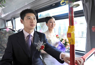 9月22日,杭州一對(duì)新人搭乘由公交車稍加裝飾而成的“婚車”出行。當(dāng)日是“國(guó)際無車日”,杭州一對(duì)新人臨時(shí)決定包租一輛環(huán)保型公交車作為婚車,表達(dá)對(duì)“無車日”活動(dòng)的支持。