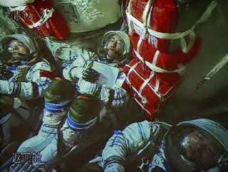 三位宇航員在起飛后的神舟七號(hào)載人飛船上。新華社記者:查春明