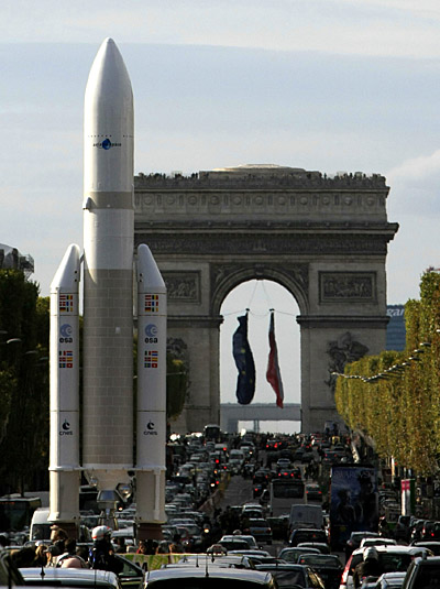 4日,一個阿麗亞娜5型火箭模型在法國巴黎香榭麗舍大街上展出。當(dāng)天,法國航空航天工業(yè)百年紀(jì)念展在香榭麗舍大街拉開帷幕,并將持續(xù)到10月12日。