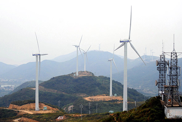 目前,浙江省內規(guī)模最大的風力發(fā)電場——岱山縣衢山風力發(fā)電場建成并投入試運行。該風力發(fā)電場總投資約4.7億元,共有48臺風力發(fā)電機,每臺風機功率為850千瓦,年上網電量預計可達到9000多萬千瓦時。