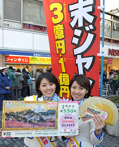25日,在日本首都東京,兩名促銷員展示年末彩票。臨近年末,成千上萬的日本人前往彩票銷售柜臺(tái)購買彩票,期望博得3億日元(約合2100萬元人民幣)的年終巨獎(jiǎng)。新華社/法新
