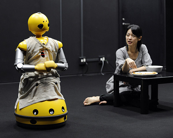 25日,在日本大阪大學,一個取名為若丸的機器人與一名女演員同臺表演。當天,這臺為媒體舉行的20分鐘演出由機器人與演員共同完成,該劇有可能于明年公演。新華社/法新