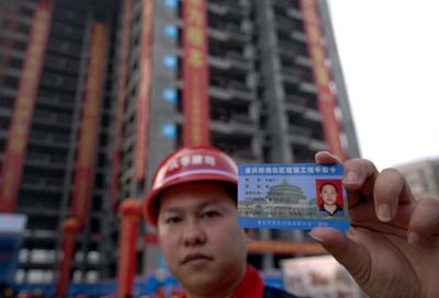 前不久,為減少重慶建設(shè)項(xiàng)目安全事故的發(fā)生,重慶市建委在渝北區(qū)某建筑工地進(jìn)行“平安卡”管理制度試點(diǎn),共培訓(xùn)農(nóng)民工1萬(wàn)多人,發(fā)放“平安卡”6000余張。通過(guò)培訓(xùn)上崗,安全事故明顯下降。圖為一名建筑工人正在展示自己使用的“平安卡”。新華社記者:劉潺
