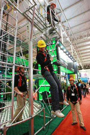 安全生產(chǎn)最重要。前不久,“第四屆中國(guó)國(guó)際安全生產(chǎn)及職業(yè)健康展覽會(huì)”在北京開(kāi)幕。參觀者在展覽會(huì)上試用緊急逃生裝置。新華社記者:李明放