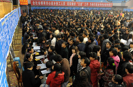 當(dāng)日,安徽省蚌埠市懷遠(yuǎn)縣政府在縣勞動力市場舉辦2009年首場大型春季企業(yè)用工暨返鄉(xiāng)農(nóng)民工現(xiàn)場招聘會,該縣的120余家企業(yè)為返鄉(xiāng)農(nóng)民工提供就業(yè)崗位3000多個。新華社發(fā)(葉勝利攝)