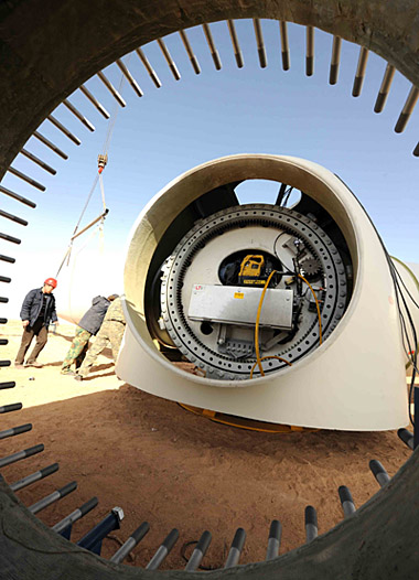2月8日,施工人員正在內(nèi)蒙古巴彥淖爾市烏拉特后旗烏力吉風(fēng)電場(chǎng)吊裝風(fēng)機(jī)。擁有得天獨(dú)厚風(fēng)能資源的內(nèi)蒙古自治區(qū)按照國(guó)家發(fā)展新型潔凈能源的產(chǎn)業(yè)政策,加快環(huán)京津大型風(fēng)力發(fā)電基地建設(shè),200多家風(fēng)電企業(yè)在內(nèi)蒙古追風(fēng)逐電“搶灘登陸”。截至2009年初,全區(qū)風(fēng)電裝機(jī)容量突破300萬(wàn)千瓦。 | |