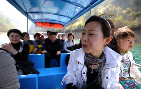 2月11日,黃華英在渡船上與游客交談。 當日,應聘到張家界大峽谷景區(qū)擔任講解員的湖南省張家界市慈利縣三官寺鄉(xiāng)返鄉(xiāng)農(nóng)民工黃華英帶著一批游客在景區(qū)內(nèi)游覽。黃華英是張家界大峽谷景區(qū)已招聘錄用的17名返鄉(xiāng)農(nóng)民工之一,此前她曾在廣東東莞一家印刷廠打工,2008年回到家鄉(xiāng)。 目前,張家界大峽谷景區(qū)講解員招聘工作仍在與景區(qū)建設同步進行中,景區(qū)管理層表示“在同等條件下優(yōu)先聘用返鄉(xiāng)農(nóng)民工”,為返鄉(xiāng)農(nóng)民工提供就業(yè)機會。 |