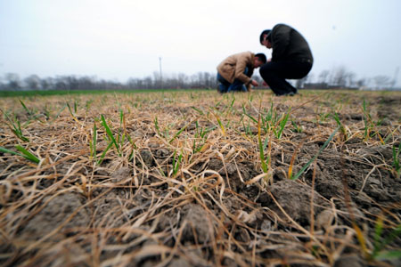 安徽省阜陽市插花鎮(zhèn)一處干旱的麥田里旱情嚴重。截至2月11日,河南、安徽、山東、河北、山西、陜西、甘肅、江蘇等主產(chǎn)區(qū)麥田受旱面積比高峰時下降了近四分之一,但目前仍有近40%的小麥受旱,抗旱形勢依然十分嚴峻。