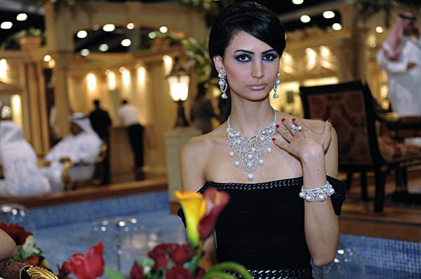 17日,一名模特展示今年流行款式的珍珠飾品。當(dāng)日,為期六天的第六屆多哈珠寶鐘表展在卡塔爾首都多哈的國際展覽中心開幕。據(jù)悉,此次參展的珠寶和鐘表總價值約20億美元。