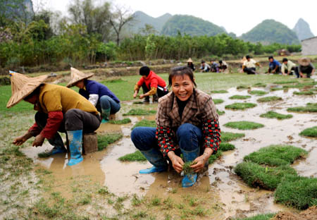 今年以來(lái),廣西柳州市柳江縣農(nóng)民和部分返鄉(xiāng)民工一起通過(guò)發(fā)展種植城市綠化的馬尼拉草皮產(chǎn)業(yè),來(lái)化解外出務(wù)工難問(wèn)題。新華社記者:張愛(ài)林