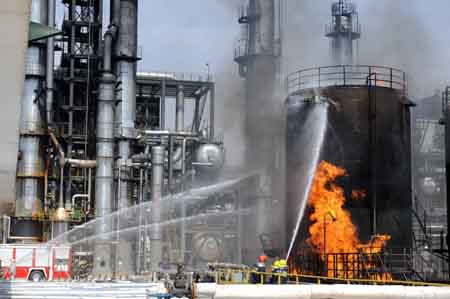 這是消防官兵正在奮力撲救(4月8日攝)。4月8日凌晨4時30分許,內(nèi)蒙古伊泰集團(tuán)煤間接液化項目基地1號、2號輕質(zhì)油儲油罐發(fā)生火災(zāi)事故,火災(zāi)未造成人員傷亡和關(guān)鍵生產(chǎn)設(shè)備的損毀。截至當(dāng)日16時10分,明火已被全部撲滅,火勢得到有效控制。