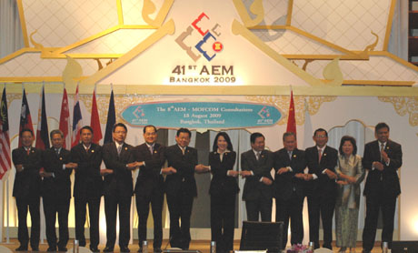15日,在泰國(guó)曼谷,中國(guó)商務(wù)部長(zhǎng)陳德銘(左六)與東盟10國(guó)經(jīng)貿(mào)部長(zhǎng)和東盟秘書長(zhǎng)素林(右一)合影。當(dāng)日,第八次中國(guó)-東盟經(jīng)貿(mào)部長(zhǎng)會(huì)議在曼谷舉行。中國(guó)和東盟簽署了中國(guó)-東盟自由貿(mào)易區(qū)《投資協(xié)議》。這標(biāo)志著雙方成功地完成了中國(guó)-東盟自貿(mào)區(qū)協(xié)議的主要談判,中國(guó)-東盟自貿(mào)區(qū)將于2010年如期全面建成。