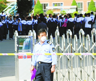 圖為:8月31日,衛(wèi)生部門一名工作人員在發(fā)生甲型H1N1流感暴發(fā)疫情的蘭州某中學(xué)大門外值班。據(jù)甘肅省衛(wèi)生廳通報(bào),截至8月30日15時(shí)已確診26例,首例病例8月28日確診。 |