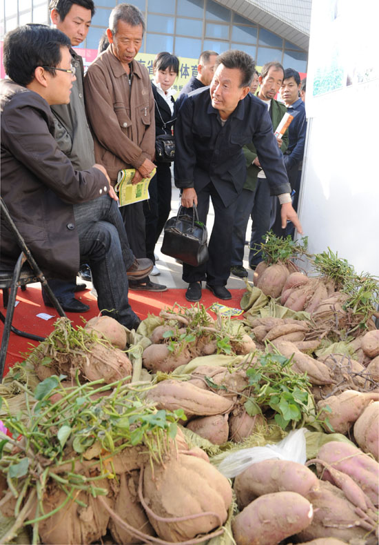 10月21日,第七屆全國(guó)特種養(yǎng)殖種植技術(shù)成果博覽會(huì)在安陽(yáng)舉行,來自河南省安陽(yáng)市等各地的數(shù)百項(xiàng)農(nóng)業(yè)新產(chǎn)品、新成果在展覽會(huì)上進(jìn)行了展示和交流。 圖為幾名農(nóng)民在博覽會(huì)上了解巨型紅薯的種植技術(shù)。