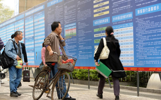 1月20日,群眾在廣州交易會流花展館春運火車票集中售取票點外查看公告欄。 1月21日起,廣鐵集團將開售實名制火車票,其中首張實名制車票將通過電話訂出。目前,準備工作已經到位。根據廣鐵集團春運售票方案,旅客可以通過各火車站售票窗口、鐵路設立的集中售票處、火車票代售點、電話訂票等四種渠道購買實名制車票,訂票線路和售票窗口數將達1萬多個,盡可能方便旅客購買春運實名制車票。