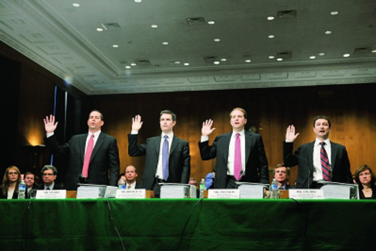 4月27日,在美國(guó)首都華盛頓國(guó)會(huì)山,包括高盛副總裁法布里斯·圖爾(前右一)在內(nèi)的高盛集團(tuán)高管出席美國(guó)參議院國(guó)土安全和政府事務(wù)永久委員會(huì)就高盛事件舉行的聽證會(huì)。聽證會(huì)上,被美國(guó)證券交易委員會(huì)指控犯有欺詐罪的圖爾否認(rèn)他向客戶隱瞞實(shí)質(zhì)性信息。委員會(huì)主席卡·萊文則表示,“高盛的行為表明它并沒有尊重客戶的價(jià)值,而是將客戶作為賺錢的對(duì)象! |