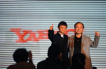 5月10日,阿里巴巴集團(tuán)董事局主席兼CEO馬云(左)與日本軟銀集團(tuán)總裁兼董事長(zhǎng)孫正義在戰(zhàn)略合作新聞發(fā)布會(huì)上。 當(dāng)日,中國(guó)網(wǎng)絡(luò)零售網(wǎng)站淘寶網(wǎng)與日本軟銀集團(tuán)控股雅虎公司在浙江杭州舉行戰(zhàn)略合作新聞發(fā)布會(huì)。根據(jù)規(guī)劃,雙方在戰(zhàn)略合作基礎(chǔ)上,將通過(guò)數(shù)據(jù)對(duì)接,計(jì)劃于6月份推出中國(guó)和日本的首個(gè)跨國(guó)網(wǎng)絡(luò)購(gòu)物平臺(tái),此次戰(zhàn)略合作被視為是中國(guó)網(wǎng)絡(luò)零售網(wǎng)站淘寶網(wǎng)選擇日本作為進(jìn)軍海外的第一站。 |