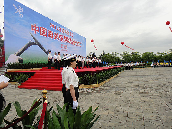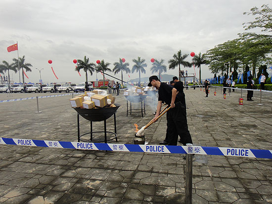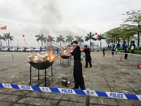 6月26日是國際禁毒日。 6月25日,廣東虎門。因當年林則徐“虎門銷煙”而聞名于世的這一地區(qū)再次聚焦了國內(nèi)外關注的目光。 這一天,海關總署在這里召開中國海關銷毀毒品現(xiàn)場會,現(xiàn)場銷毀海洛因3750包共1033.36公斤!督(jīng)濟參考報》記者在現(xiàn)場看到,波光粼粼的海面上,一艘艘緝私艇傲然排列,地面方陣由6個海關人員方隊、12輛緝私警車、2輛海關查驗車組成,每輛車前都站著一名全副武裝的緝私警察和一條機警的緝毒犬。最惹人注目的,是地上那用塑料袋包裝得整整齊齊、一包一包鋪滿了整個籃球場那么大地面的海洛因。 隨著海關總署盛光祖署長的一聲令下,八個銷毀爐同時點火,艦艇、警車同時鳴笛,令多少走私分子趨之若鶩、鋌而走險的海洛因在騰起的火焰中煙消云散。那一刻,氣氛如此威嚴,如此震懾。 截至今年5月底,全國海關共查獲走私毒品案件657起,繳獲各類毒品共計2433.5公斤,抓獲犯罪嫌疑人721名。特別是去年下半年以來,深圳、黃埔海關連續(xù)在貨運渠道查獲多起特大走私海洛因案,繳獲海洛因達1噸以上,取得了海關貨運渠道查緝毒品走私的重大突破。其中黃埔海關偵破的“10.9”系列特大毒品走私案,是新中國成立以來海關查辦的最大的海洛因走私案。