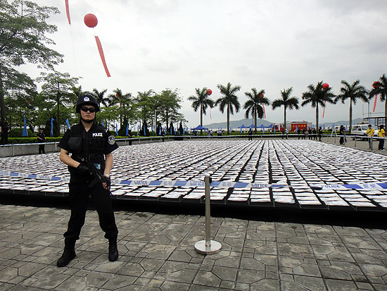 | 海關總署25日上午在廣東虎門舉行儀式,銷毀全國海關近年來查獲的上噸走私毒品。圖為現(xiàn)場準備銷毀的海洛因。 |