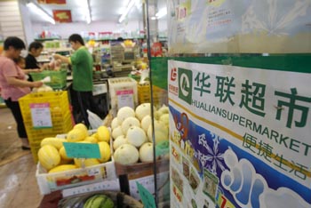 6月28日,市民在上海徐匯區(qū)的一家華聯(lián)超市內(nèi)選購商品。近日,上海兩大超市品牌“聯(lián)華超市”和“華聯(lián)超市”完成重組整合,躍居中國(guó)最大的連鎖標(biāo)準(zhǔn)化超市企業(yè)。聯(lián)華、華聯(lián)將于今年7月10日起合署辦公。據(jù)介紹,整合后新聯(lián)華門店規(guī)模將突破3500家,銷售規(guī)模近500億元。