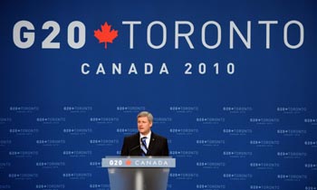 6月27日,在加拿大多倫多會議中心,加拿大總理哈珀在二十國集團首腦會議閉幕新聞發(fā)布會上講話。第四次二十國集團峰會當天在多倫多閉幕,會議發(fā)表了《二十國集團多倫多峰會宣言》。新華社記者