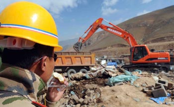 武警水電部隊官兵在結(jié)古鎮(zhèn)利用大型機械清運建筑廢墟。新華社記者 侯德強