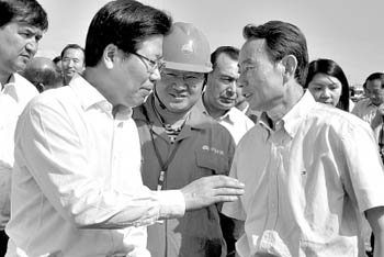 新疆維吾爾自治區(qū)黨委書記張春賢(左)告訴蔣潔敏(右):“中國(guó)石油對(duì)新疆發(fā)展提出的總體規(guī)劃令人鼓舞。”李新民