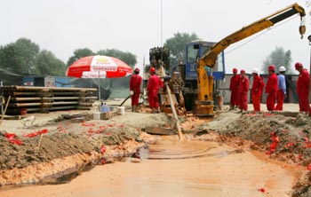 塔輪天然氣管道復(fù)線成功穿越中國(guó)最長(zhǎng)內(nèi)陸河。施工人員正在現(xiàn)場(chǎng)作業(yè)(8月8日攝)。新華社發(fā)(陳士兵