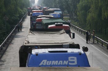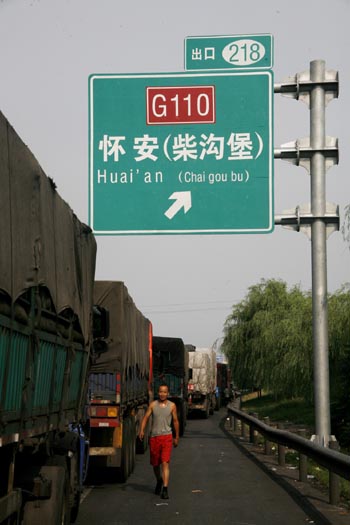走這條路的大部分是從內(nèi)蒙古和山西來的拉煤的大貨車,而據(jù)記者了解這些車輛超載現(xiàn)象比較嚴(yán)重,司機(jī)反映貨運(yùn)價(jià)格太低,再加上一路上的過路費(fèi),如果不超載就沒有利潤。而一路上每個(gè)地區(qū)都有治理超載的站點(diǎn),每到一個(gè)站點(diǎn)都要進(jìn)行稱重、卸載,面對如此大數(shù)量的大貨車,必然造成了擁堵。