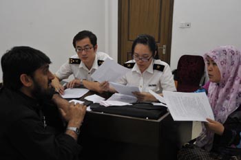 圖為海關(guān)關(guān)員通過翻譯向販假外商了解其知假販假情況。 |