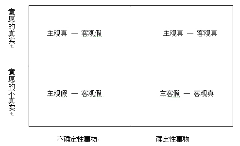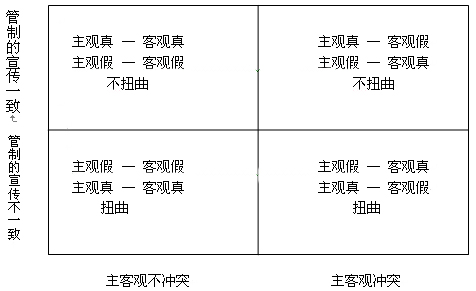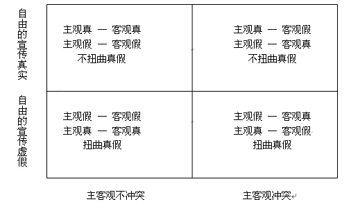 事物存在狀態(tài)的確定性是客觀的真實,它與主觀對真假的判斷無關,它由真實的信息提供;對事物的主觀滿意是事物的主觀真實,它可以與客觀的真實無關,它由事物的意義、屬性、功能、效用與消費者的個性偏好的對稱性決定。對事物的傳播表達與事物的主觀或客觀的真實不一致屬于宣傳上的不真實,它由權力的不制衡和社會道德缺失決定。這三類真假的沖突見下圖: