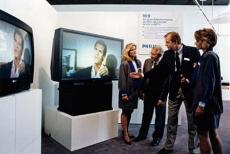飛利浦在1989年IFA上展出了一款16:9寬屏電視機。飛利浦當時稱這種電視“為90年代的觀眾提供一種全新的圖片格式”。寬屏電視機系統(tǒng)最初被用于歐洲的衛(wèi)星電視廣播,隨后一些模擬電視廣播也采用了該技術(shù)。不過,直到數(shù)字電視廣播成為主流之后,這一格式才得到廣泛應(yīng)用。