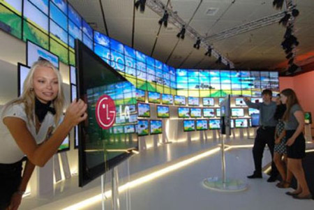 除3D技術(shù)外,過去幾年IFA上,超薄電視機一直都是展覽的熱點。當電視廠商將電視機的屏幕尺寸突破100英寸之后,他們開始轉(zhuǎn)而關(guān)注電視的厚度。在這張照片中,一名模特正在展示一款LG超薄電視。